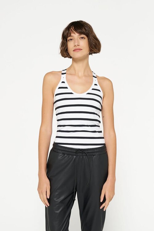Slim fit model wrapper met horizontale zwart/witte strepen en gekruiste bandjes achter. <br />Gemaakt van biologisch katoen en de hals heeft een vintage afwerking. <br />Ideaal om onder elke look te dragen door de comfortabele pasvorm en zachte stof. Lees meer.