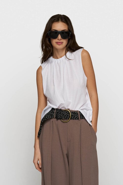 De elastische halslijn met plooien, de raw-edge afwerkingen en de subtiele 10-monogram borduring op de schouder geven deze top de herkenbare 10DAYS uitstraling.