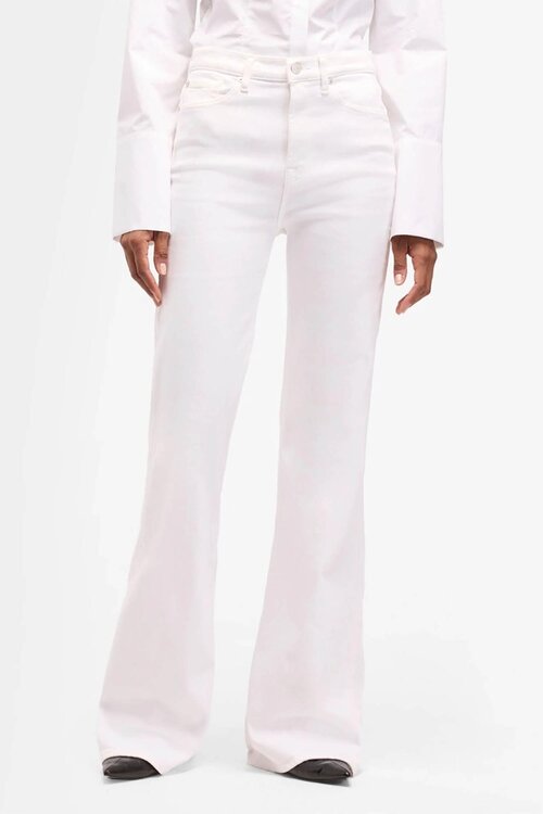 De Modern Dojo in Luxe Vintage is een high-waist flare jeans met een iets hogere taille en een subtiel bredere pijp dan de originele Dojo. Hij sluit mooi aan rond heupen en dijen en loopt wijd uit voor een elegante, verlengende look in frisse white denim.