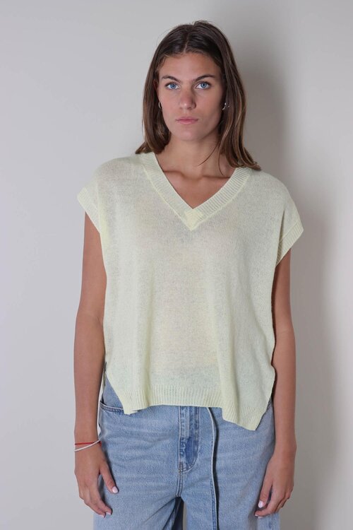 Limelight is een kleur die goed staat op zowel lichte als donkere huidstinten en prachtig combineert met wit, ecru, denim en kakitinten. De zijsplitjes zorgen voor extra bewegingsvrijheid en geven de trui een lichte speelsheid. De geribde afwerking aan de randen — armsgaten, V-hals en onderrand — houdt de vorm intact en geeft de trui een verzorgde uitstraling.