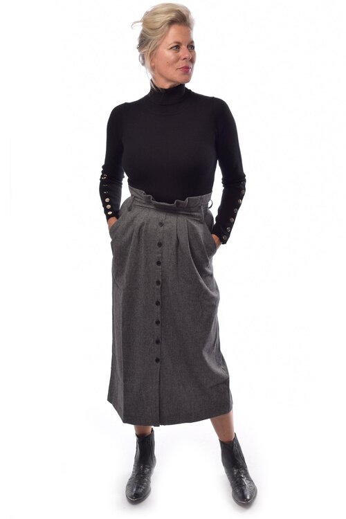 Donkergrijze midi-rok van Ba&sh! In een retro model met rechte pasvorm. Deze rok heeft een hoge taille en steekzakken. Dankzij de riemlusjes kun je deze rok leuk combineren met een riem. Draag er laarzen onder en je look is comleet!