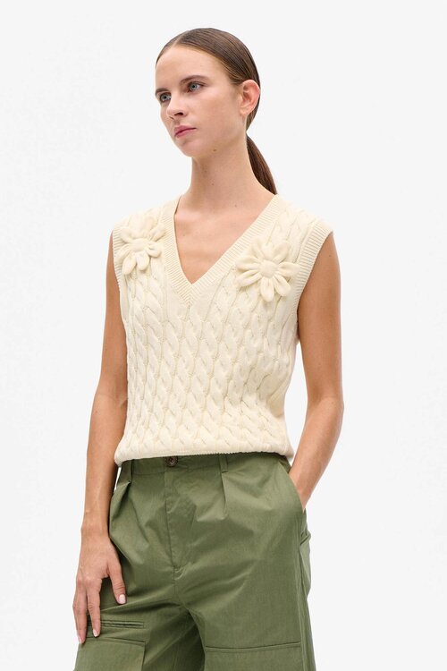 De Baum und Pferdgarten Carli Sweater in Glowing Cream is een verfijnde knit die Scandinavisch design combineert met vrouwelijke details. Deze kabelgebreide sweater met elegante V-hals en subtiele bloemdecoratie op de borst straalt zachtheid en kracht tegelijk uit. De warme crèmetint maakt dit item moeiteloos combineerbaar en perfect voor een moderne, stijlvolle garderobe.