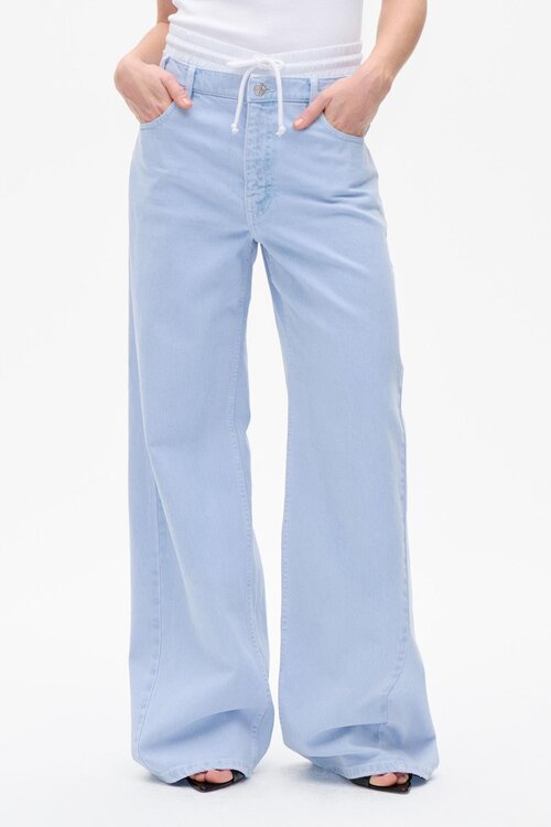 De contrasterende elastische tailleband met trekkoord, de wide legs en het 5-pocket design geven deze jeans een eigentijdse en opvallende uitstraling.