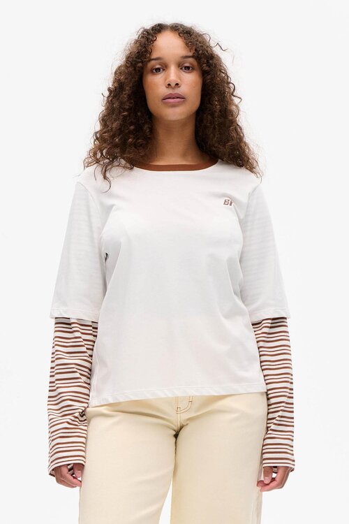 Het Jolin T-shirt heeft een relaxed fit en een crew neck, wat zorgt voor een casual, moeiteloze uitstraling die perfect past binnen de hedendaagse garderobe. De dubbele mouwlaag – korte mouw over een longsleeve-effect – geeft het item een unieke layered look zonder dat je extra lagen hoeft toe te voegen, ideaal voor transitional seasons en laagjes-looks.