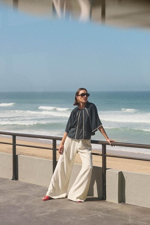 De combinatie van een high waist, lange pijpen, subtiele streep en praktische zijzakken zorgt voor een comfortabele en veelzijdige broek die makkelijk te stylen is.