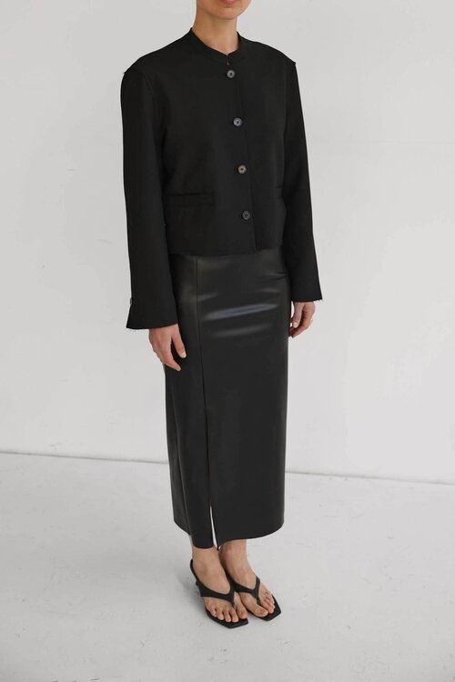 De Selia Skirt van Club L’Avenir is een moderne, zwarte midi-rok met verfijnde snit. Minimalistisch, vrouwelijk en krachtig in eenvoud — een stijlvolle basis voor talloze looks.