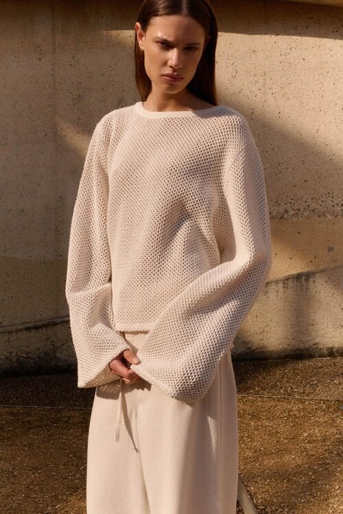 De Oriana’CL van Club L’Avenir is een verfijnde knit top in de kleur Ecru met een open geweven structuur. De losvallende fit en lange mouwen zorgen voor een nonchalante, luxe uitstraling, perfect voor een moderne en minimalistische look.