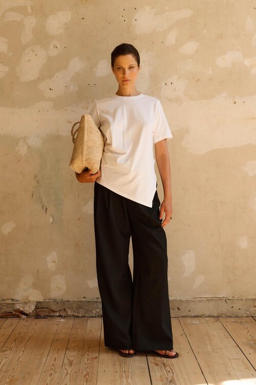 • Combineer met een zwarte wide-leg pantalon voor een clean contrast