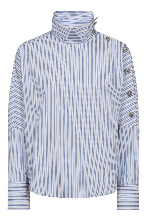 Deze gestreepte Co'Couture Devin top in katoenmix is een losvallend model met een moderne opstaande boord en opvallende knoopdetails. Een frisse, stijlvolle keuze voor elke dag.