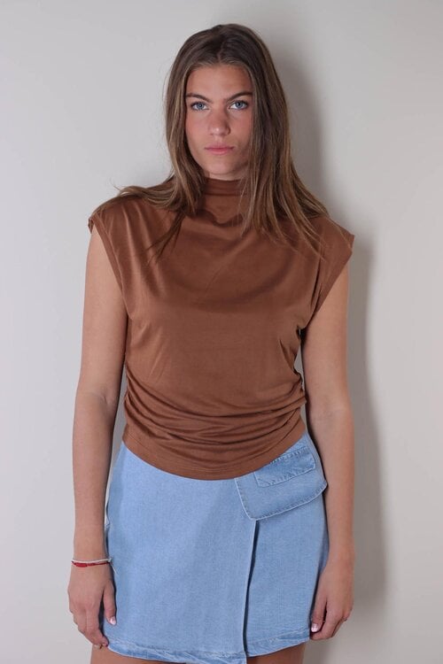 De Co’Couture Camilla Shirt in oranje (Flame) is een modern en vrouwelijk mouwloos T-shirt met een elegante, hoge halslijn. De slim fit pasvorm en het subtiele rimpeldetail aan de zijkant geven dit item een verfijnde en flatterende uitstraling.