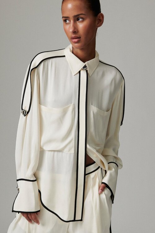 De Stello crepe blouse van DAY by Birger et Nikkelsen is een soepele button-up top met een krachtige, moderne uitstraling. Contrast piping, schouder-epauletten en twee borstzakken geven een refined look, terwijl de dipped hem zorgt voor een moeiteloos silhouet.