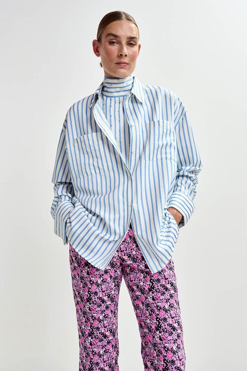 De Essentiel Antwerp Janna striped shirt is een opvallend oversized overhemd met klassieke strepen en een subtiele sparkle. Dankzij de losse, vloeiende fit en de aparte plastron met strasdetail creëer je moeiteloos een gelaagde look die meteen bijzonder aanvoelt.