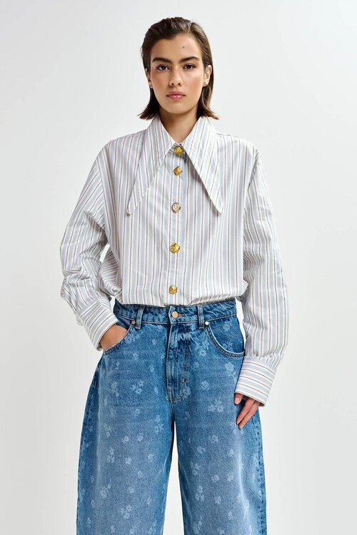 De Essentiel Antwerp Jomato striped shirt is een modern oversized katoenen overhemd met grafische strepen en een verrassend detail: mismatch knopen. De verlengde kraagpunten kun je ook knopen voor een alternatieve styling, waardoor dit item net zo veelzijdig is als opvallend.