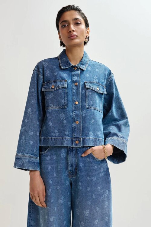 Blauw cropped jeansvest van Essentiel Antwerp met bloemmotief