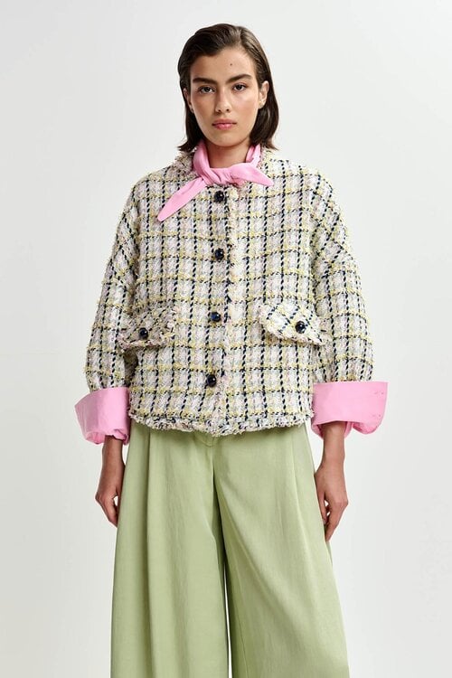 De Essentiel Antwerp Jayden Check Jacket is een bouclé jas met een preppy uitstraling en een comfortabele oversized pasvorm. De lage mouwinzet en volumineuze 3/4-mouwen geven ‘m een moderne twist, terwijl de boorddetails en stoffen knopen zorgen voor een verzorgde finish.