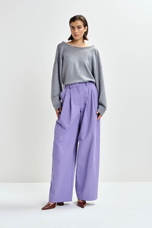 De Essentiel Antwerp Jazmine pants in paars is een elegante wide-leg broek met slimme plooien in de taille die mooi doorvallen in een soepel, wijd silhouet. Met middelhoge taille, riemlussen en een nette sluiting is dit een statement pantalon die je moeiteloos van day-to-night draagt.
