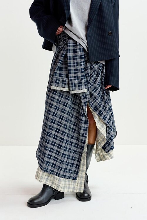 De lange contrast rok in navy van Essentiel Antwerp valt op door zijn speelse kleurcontrasten en vloeiende stof. Lees meer.