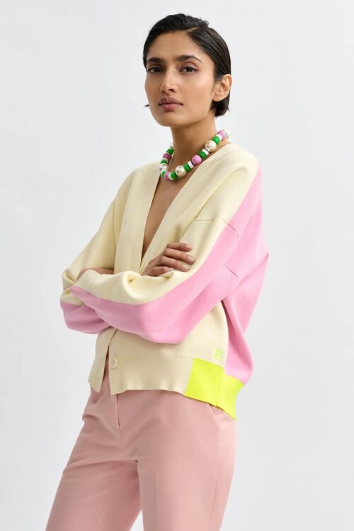 Essentiel Antwerp JICOLOR fijngebreide colorblock cardigan gebroken wit/roze/geel