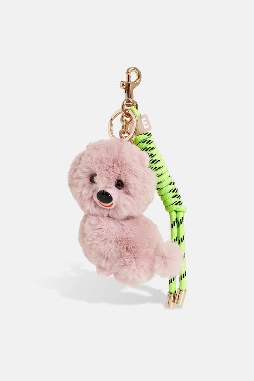 Essentiel Antwerp JACI bag charm met fluffy hondje en goudkleurige hardware. Lichtroze/felgeel, met ring- en musketonsluiting. Shop nu! Lees meer.
