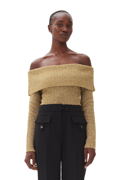 Stralend en stijlvol, deze gouden sparkle off-the-shoulder blouse vab Ganni is een ware blikvanger Lees meer.