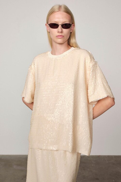 Het Larsson T-shirt is een uitgesproken statement piece met een verfijnde, moderne twist. De zachte glans van de gerecyclede paillettenstof geeft een luxe uitstraling, terwijl de relaxte pasvorm zorgt voor moeiteloos draagcomfort.
