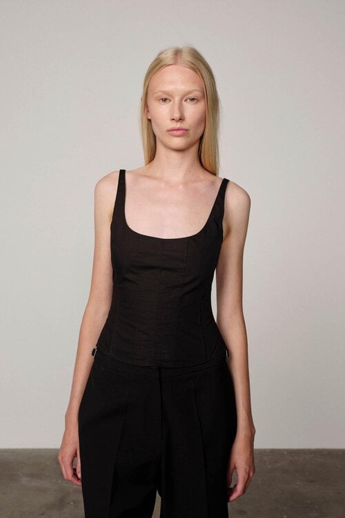 De Freja Top is een vrouwelijke, gestructureerde top met een verfijnd corset-gevoel. De strakke lijnen en interne baleinen creëren een elegant silhouet dat kracht en zachtheid perfect in balans brengt.
