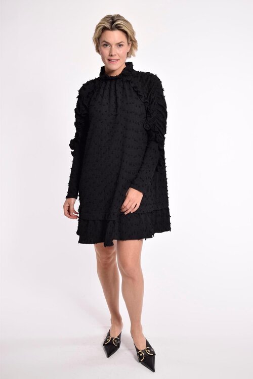 Het ontwerp is voorzien van subtiele maar opvallende details, zoals de knoopsluiting, de hoge halslijn en de zachte plooien die zorgen voor een vleugje beweging.Maak de jurk meer casual door hem te combineren met enkellaarsjes en een leren jack voor een relaxte maar toch stijlvolle uitstraling.
