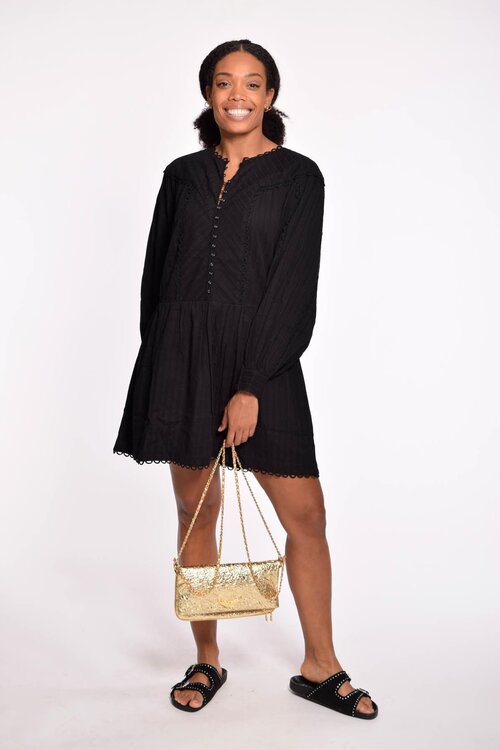 De Magali Pascal Black Dress Mirabelle is een veelzijdige en elegante jurk voor verschillende gelegenheden. Met zijn tijdloze zwarte kleur en verfijnde ontwerp straalt de jurk tijdloze elegantie uit. De flatterende pasvorm en subtiele details, zoals de ruches aan de mouwen en de knoopsluiting aan de achterkant, voegen een vleugje verfijning toe.
