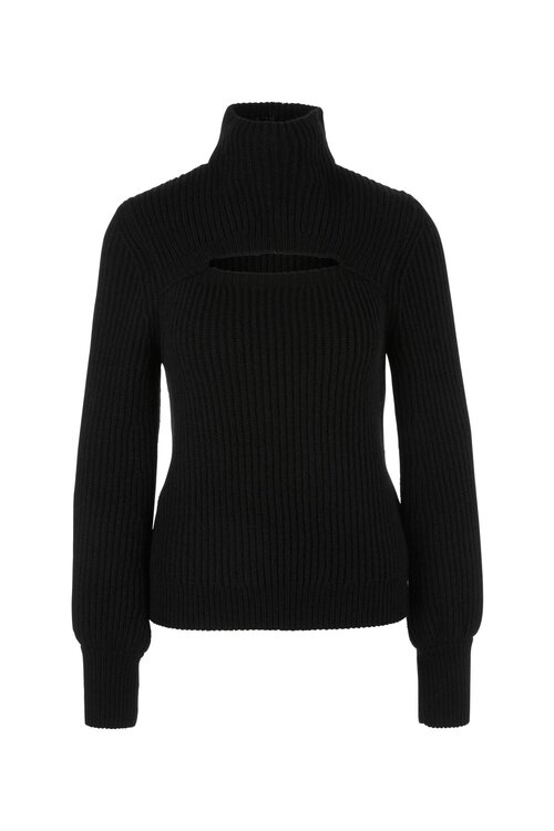 Deze trui heeft een eivormig silhouet, wat zorgt voor een eigentijdse en comfortabele pasvorm. Het heeft een hooggesloten kraag, wat niet alleen een stijlvol detail is, maar ook voor extra warmte zorgt. Een opvallend en cool detail van de trui is de cut-out bij het decolleté, wat een speels en eigentijds element toevoegt aan het ontwerp en zorgt voor een vleugje verfijning. De trui is gemaakt van een chique mix van garens, waaronder scheerwol, kasjmier en zijde. Deze combinatie van materialen maakt de trui zacht en licht, en zorgt voor een luxe gevoel op de huid.