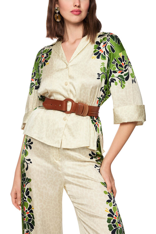 De combinatie van pyjamastijl en de printmix met luipaardpatroon en hibiscusbloemen geeft deze blouse een unieke en modieuze uitstraling.