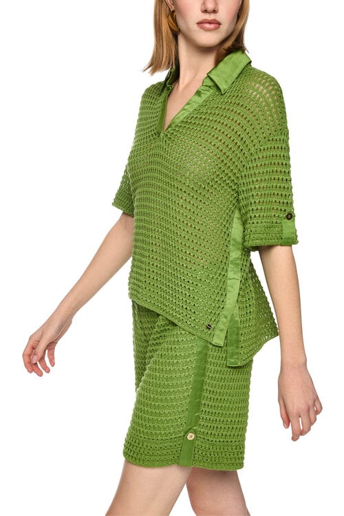 Deze Marc Cain trui in garden green combineert een verfijnd ajourpatroon met subtiele glans en duurzame materialen voor een elegante, luchtige look.