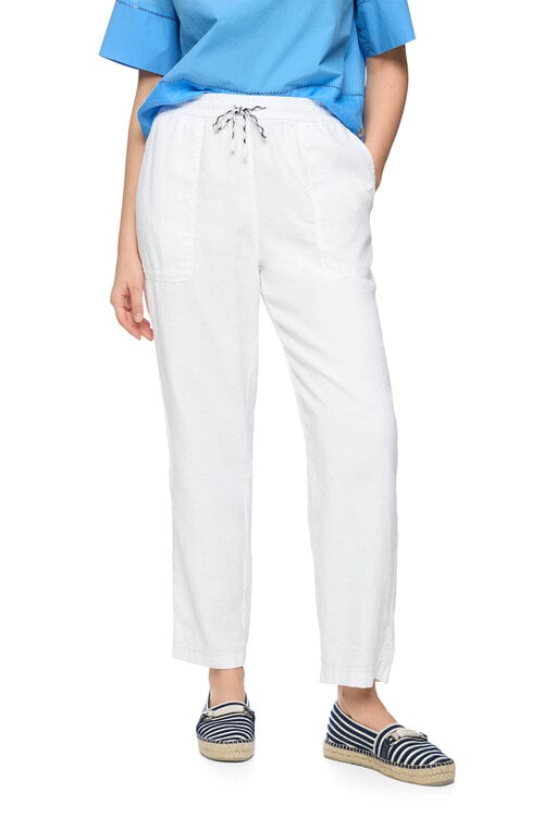 De Marc Cain RANCHI broek in wit combineert een ontspannen pasvorm met een moderne, elegante uitstraling en hoog draagcomfort.