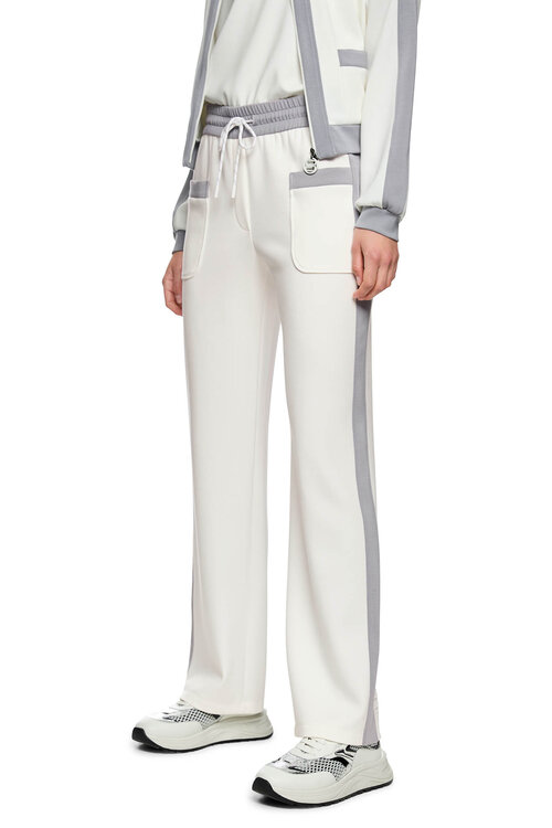 Deze off-white Mon Cherry pantalon van Marccain biedt een moderne wide fit met sportieve details zoals contrasterende strepen en een elastische tailleband met trekkoord.