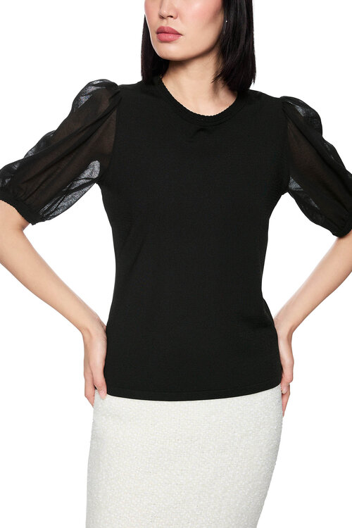 Deze zwarte Neutral Affinity trui van Marccain combineert een nauwsluitende viscose-stretch kwaliteit met vrouwelijke, semi-transparante pofmouwen en verfijnde “Knitted in Germany”-afwerking.