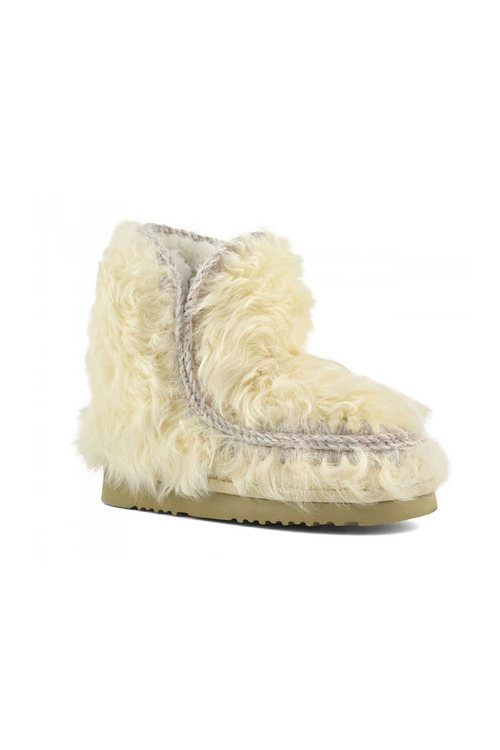 De Mou Eskimo 18 Chekiang Fur in de kleur Vanilla is een handgemaakt icoon van natuurlijke luxe. Deze winterboot combineert zacht geitenbont met een warme schapenvachtvoering en de kenmerkende Mou-afwerking.