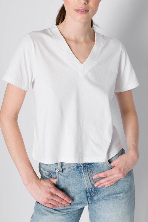 The Victoria van Neeve is een clean, cropped T-shirt in Crispy White met een flatterende V-hals en korte mouwen. De stevige 180g kwaliteit zorgt voor een mooie vorm en een verfijnde uitstraling—perfect voor elke dag.