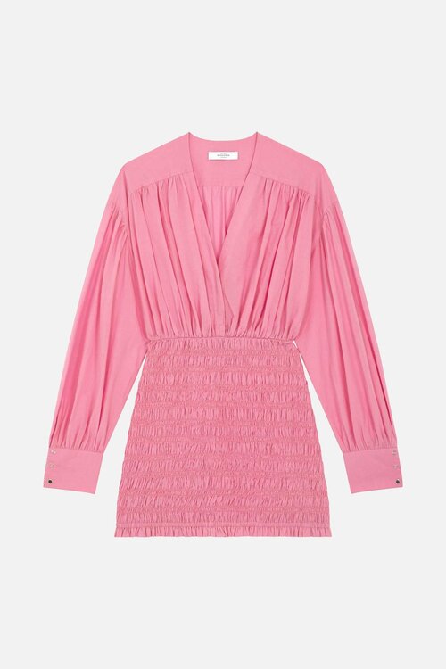 Deze licht katoenen poplin ROSEANNA jurk in de kleur roze is losjes gesneden aan de bovenkant en nauwsluitend aan de onderkant. Het is gesmokt aan de onderkant met lange, wijd uitlopende mouwen die afgesloten worden met metalen drukknopen. Deze jurk is van 100% katoen, wasbaar in de machine met dezelfde kleuren. Chloor en het drogen in de droger zijn niet toegestaan. Strijken mag, maar dan op lage temperatuur. Deze jurk is perfect om te dragen bij een leuke gelegenheid. Je kan de jurk stijlen met een paar mooie sieraden en een paar mooie laarzen of met sneakers voor een casual look.