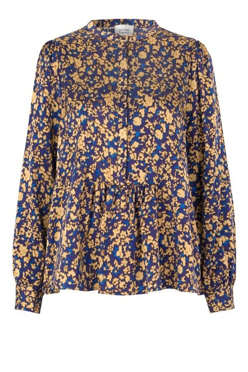 Second Female damesblouse met all-over print, gemaakt van 100% viscose. De bloemenprint bestaat uit de kleuren paars, geel en blauw. Deze blouse met een losvallend recht model en lange mouwen heeft een ronde hals. Heeft smalle manchetten en een licht geplooide band vanuit de taille. In combinatie met de verdekte knoopsluiting en glanzende stof zorgt dit voor een bijzondere uitstraling. Hierdoor is deze ‘Multicolour Spirit Blouse’ ideaal om op allerlei manieren gecombineerd te worden. Draag deze blouse bijvoorbeeld met een spijkerbroek en stoere boots of in combinatie met een lederlook rok en pumps. Of ga voor de complete look en draag deze blouse met de bijpassende rok in dezelfde bloemenprint.