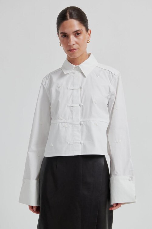 Het Second Female Silva Shirt is een stijlvolle blouse met een clean, modern silhouet. Gemaakt van 100% katoen en afgewerkt met een opvallende frontsluiting en brede manchetten voor een elegante, eigentijdse look.