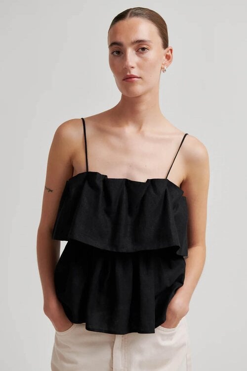 Second Female Aie top in zwart. Luchtige linnen-viscose top met verstelbare bandjes en volantdetail. Shop nu bij Van Dort Mode. Lees meer.