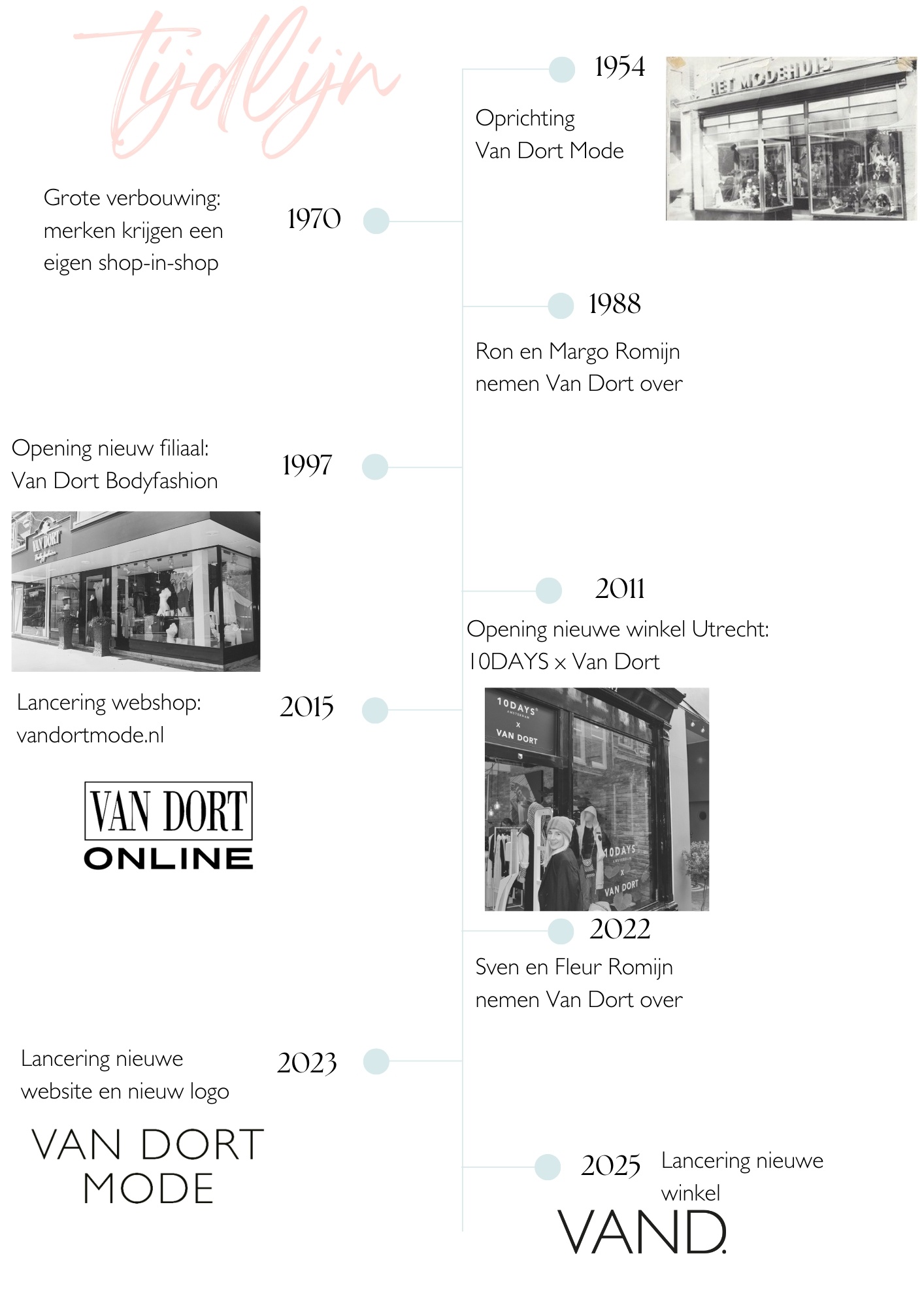 Familiebedrijf ‘Modehuis van Dort’ werd in 1954 opgericht. Familie Van Dort opende voor de oorlog een textielzaak in Den Haag en daarna verhuisden zij naar Bilthoven. Destijds verkochten we niet alleen dames- en ondermode, maar ook fournituren, stoffen en textiel. Begin jaren '70 was er een grote verbouwing waarbij verschillende shop in shops werden toegevoegd aan de winkel, dit betekent een stuk in de winkel toegeweid aan een specifiek merk. Fournituren en stoffen bleven maar we stopten met het verkopen van textiel.