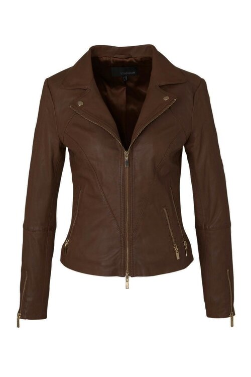 Bruine lerenjas van Studio AR by Arma. De jas is volledig gevoerd en heeft drie buitenzakken. De jas is voorzien van ritssluiting. De pasvorm is normaal.